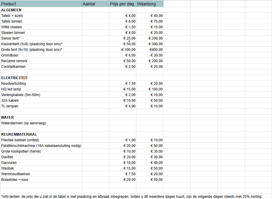 Wij verhuren heel wat materialen aan schappelijke prijzen. In de onderstaande... vindt u een overzicht van de materialen en hun bijhorende verhuurprijs en waarborg.